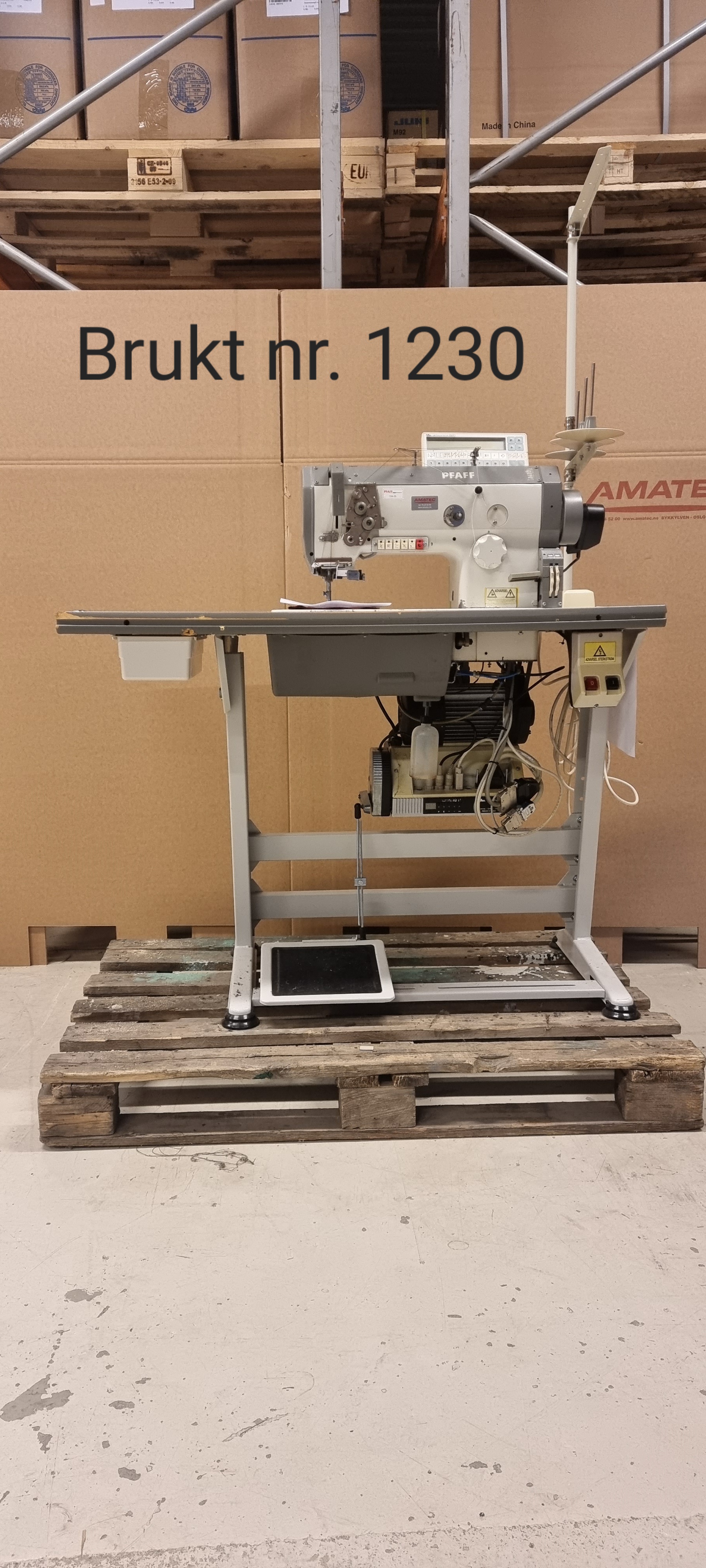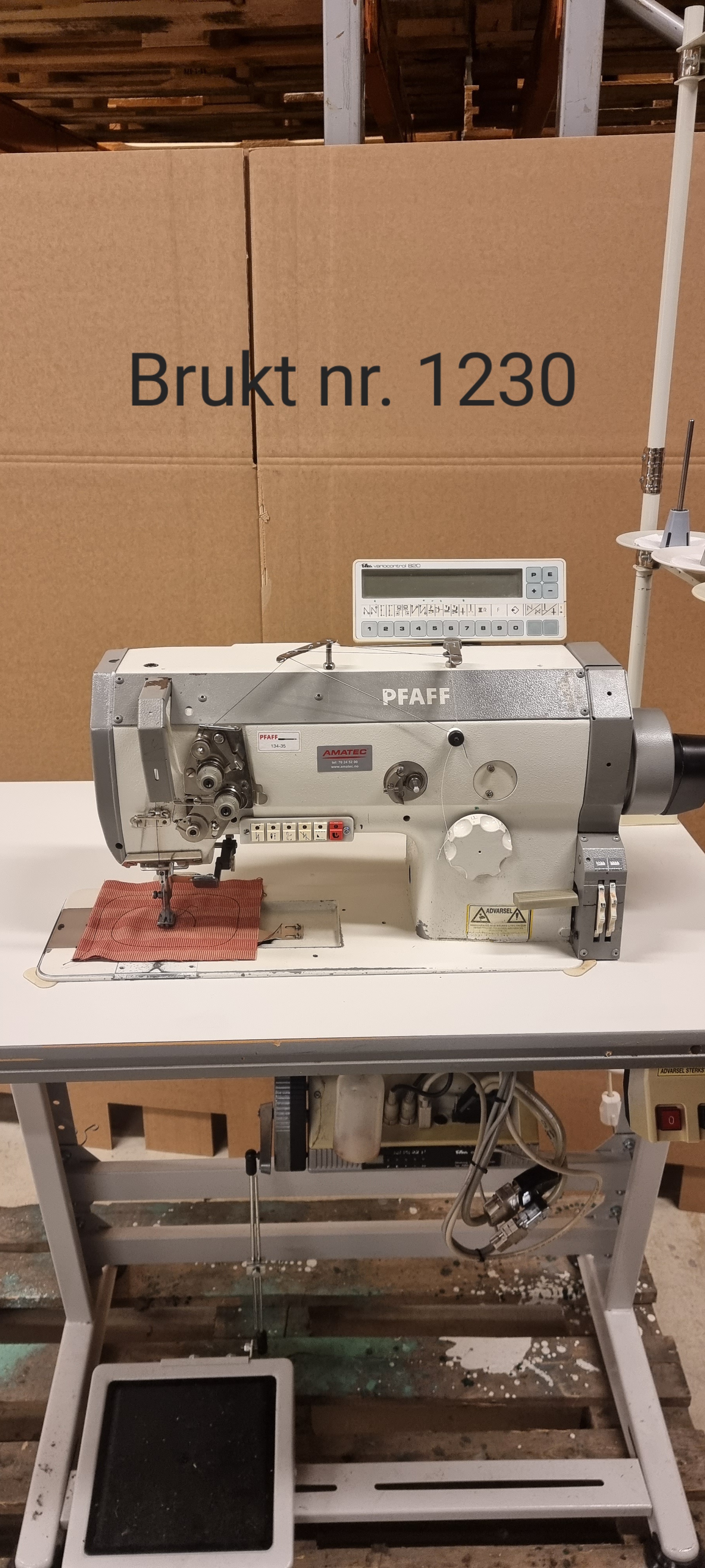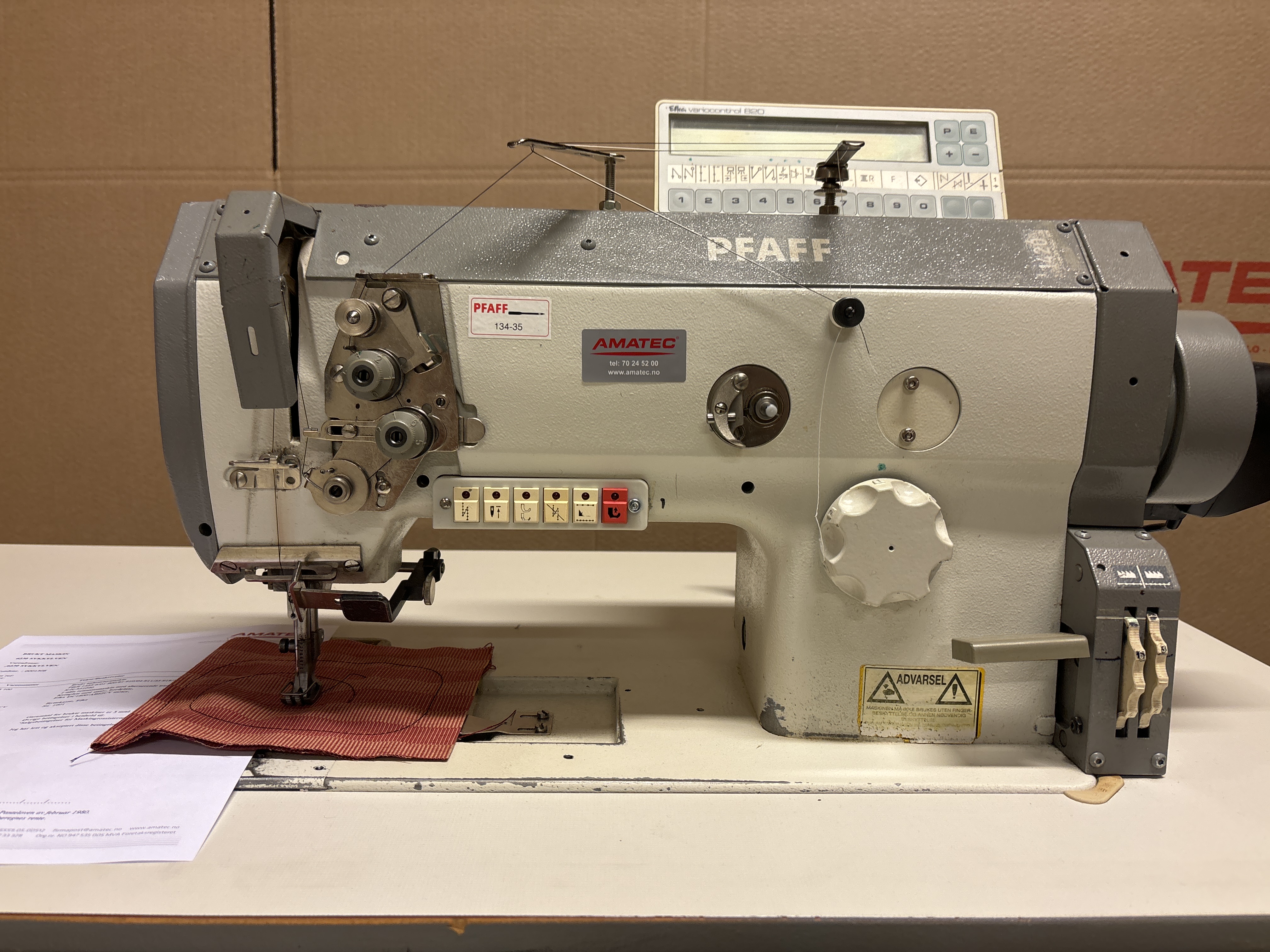1-nåls hurtiggående rettsømsmaskin (skyttelsøm stingtype 301) med over-, under- og nåltransport og alternerende labber. Maskinen er utstyrt med automatisk trådkutter, automatisk festing i start og stopp og automatisk labbløft. Automatikk for veksling mellom to forskjellige forhåndsinnstilte stinglengder, og hurtigomstilling mellom høy og lav alternering. Maks stinglengde er 8 mm., og maks sømhastighet er 4000 sting pr. min. Labbløft maks 17 mm. Maskinen leveres komplett med bordplate, nytt høydejusterbart stativ og 1-faset elektronisk servomotor Efka DC1600/AB62CV. Maskinen krever trykkluft.