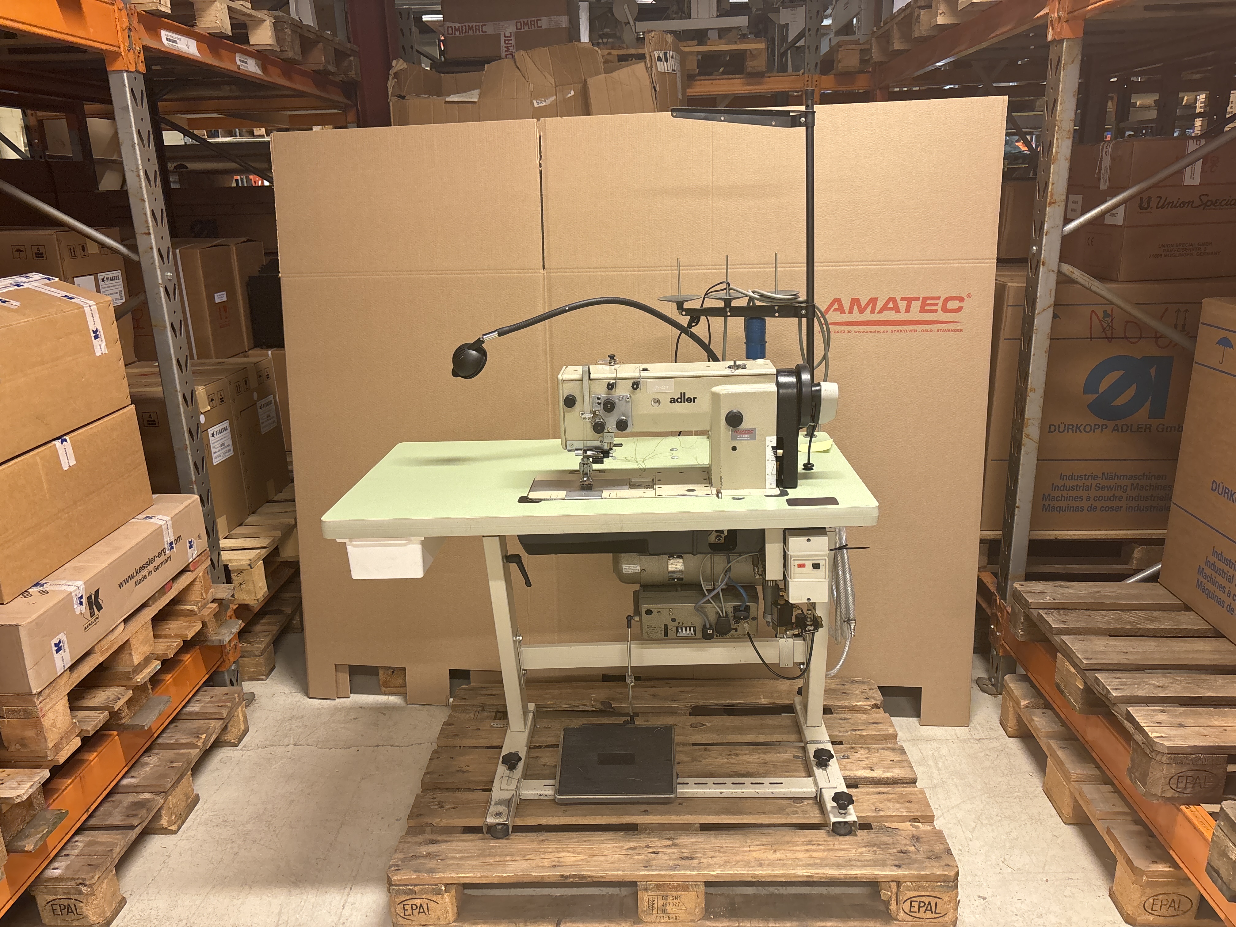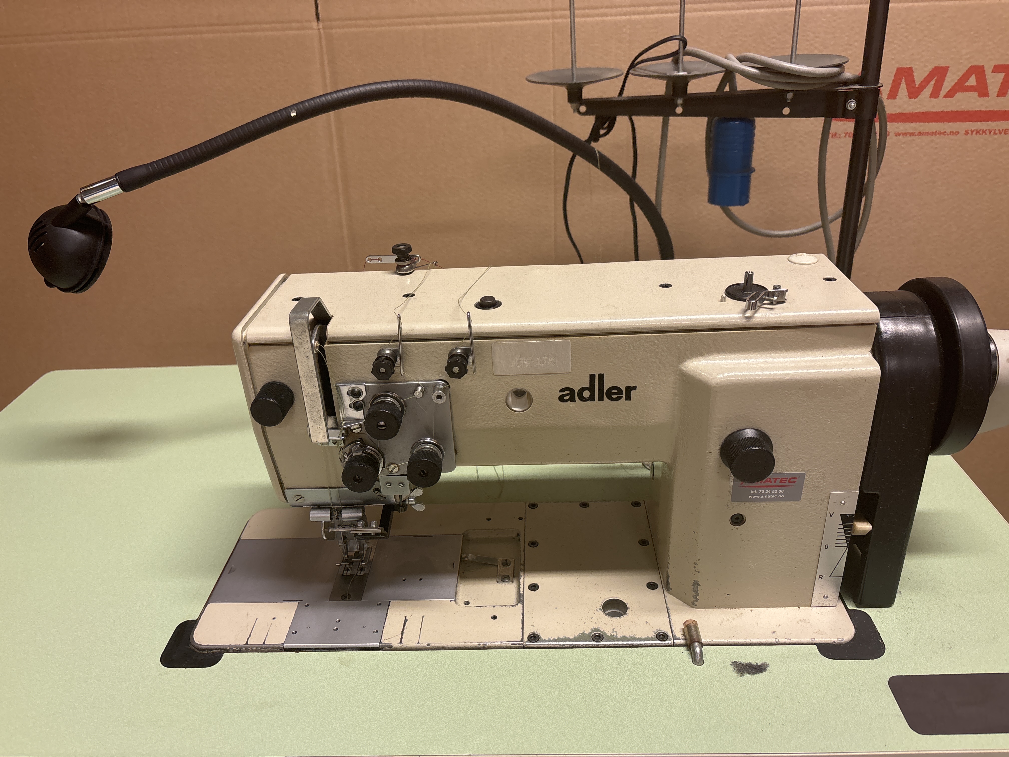 2-nåls rettsømmaskin. Nålavstand 10 mm, trådkutt og labbløft. Trådfesting start og stopp. Ledlampe.