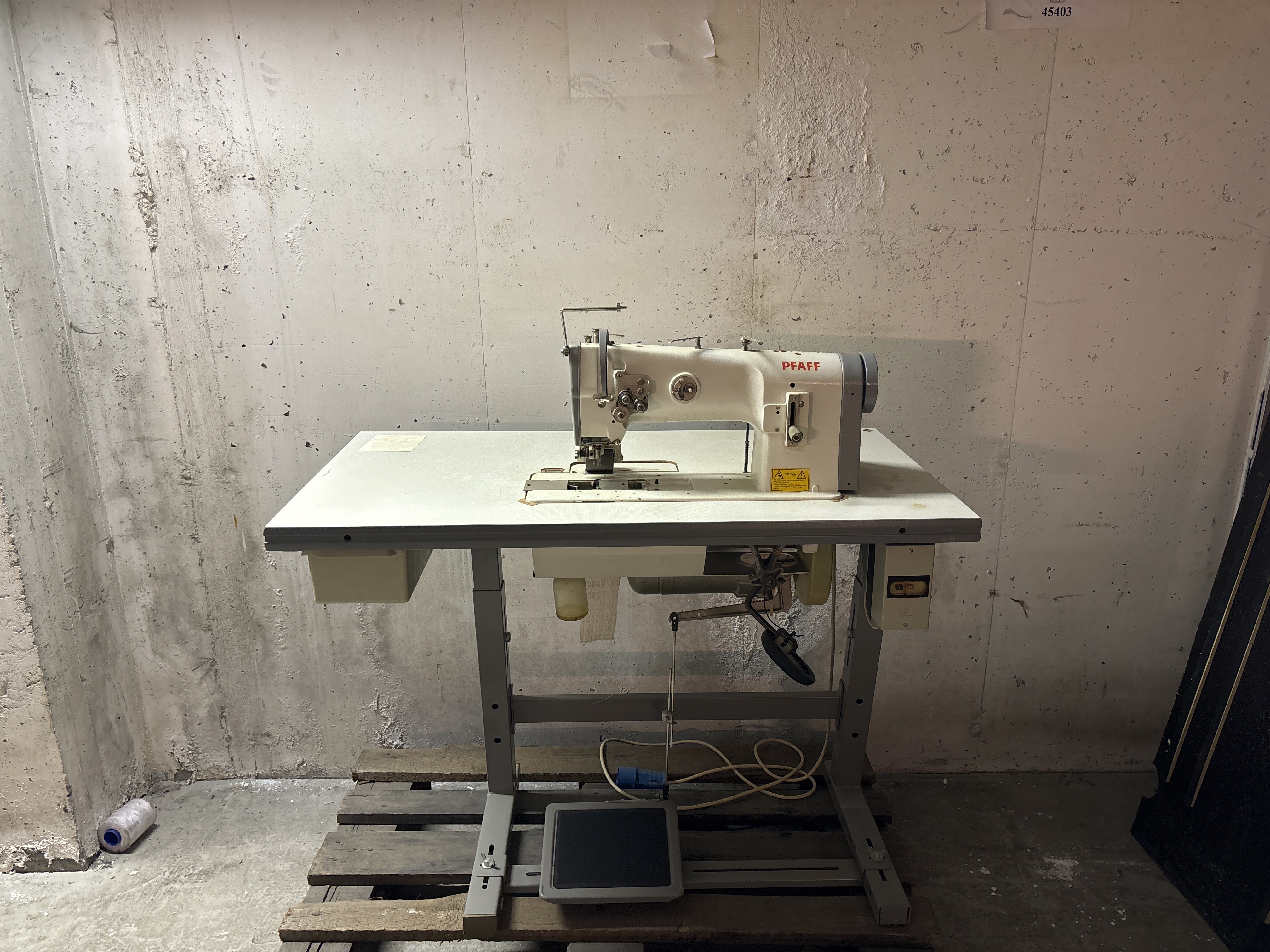2-nåls skyttelsømsmaskin med nåltransport og orignal Pfaff pullertransport med valse over og under. Trekk på undervalsen. Nålavstand 66 m.m. Kneløft for labben, båndrullsholder. Komplett med Kessler standard stativ, bordplate, Fir cutchmotor 1400 3-fas. og belysning.