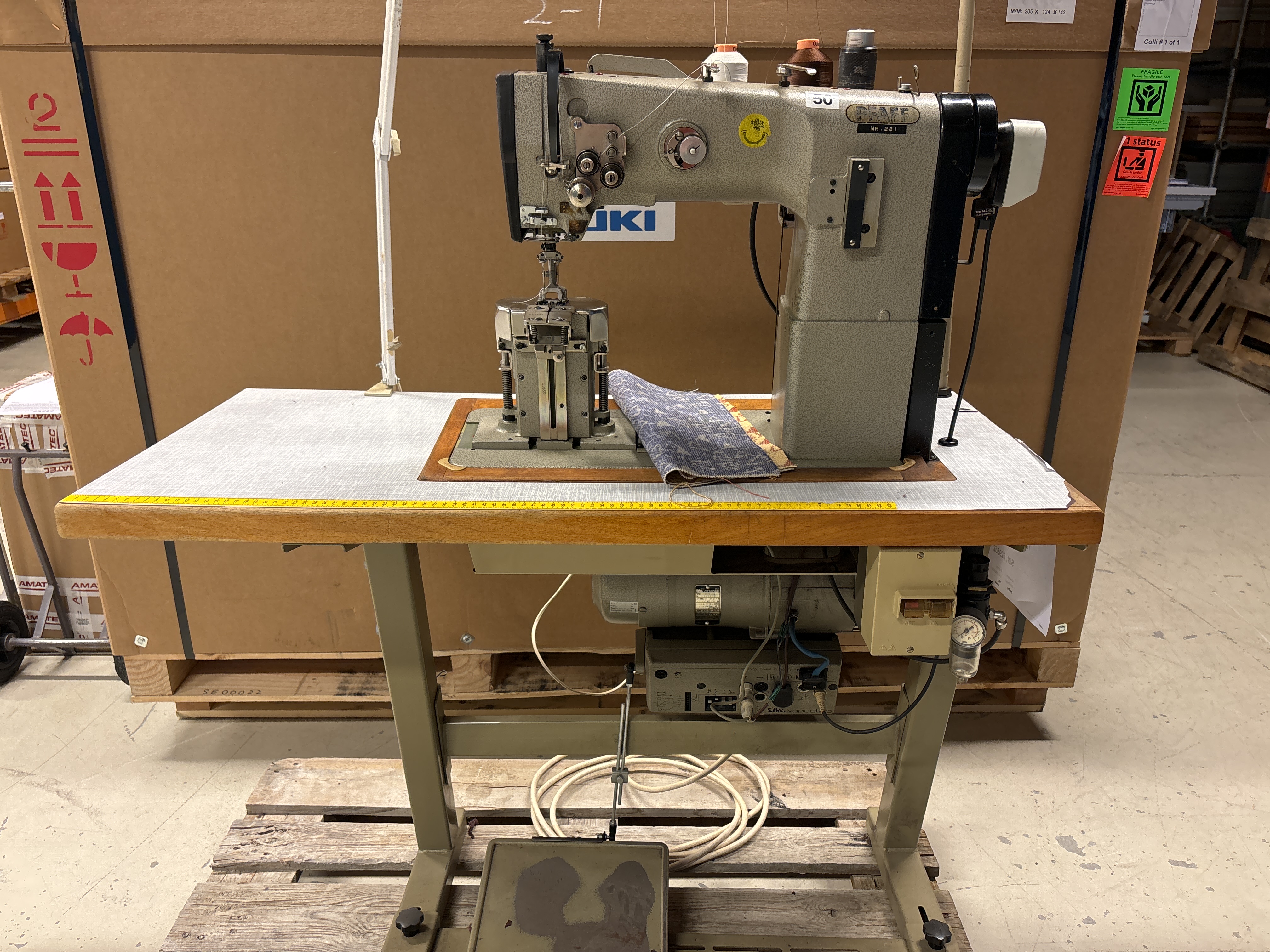 Maskinen har automatisk trådkutter, automatisk labbløft og automatisk festing. Også festing via trykknapp ved nålen. Komplett med bordplate, stativ og Efka 3-faset motor.