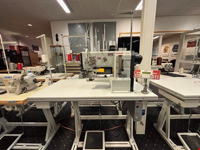 1-nåls rettsømsmaskin med alternerende transport for søm av møbel, kalesje m.m. Maskinen har automatisk trådkutter, festing og labbøft.